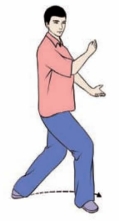 要点:上体不可前俯后仰,不可顶髋下蹲,脚部必须宽松舒展。两臂分开时要保持弧形。身体转动时要以腰为轴。弓步动作与分手的速度要均匀一致。做弓步时,迈出的脚先是脚跟着地,然后脚掌慢慢踏实,脚尖向前,膝盖不要超过脚尖;后腿自然伸直;前后脚夹角约成45°~60°(需要时后脚脚跟可以后蹬调);野马分鬃式的弓步,前后脚的脚跟要分在中轴线的两侧,它们之间的横向距离(即以动作行进的中线为纵轴,其两侧的垂直距离为横向)应保持在10~30cm。