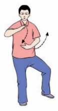 要点:完成姿势不要挺胸,左膝要微屈,重心不要上下起伏,两臂上下都要保持半圆形,身体重心后移和右手上提、左手下按要协调一致。