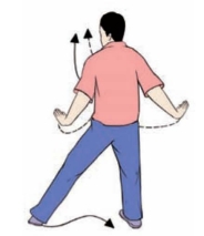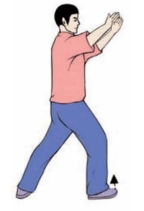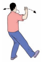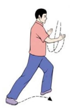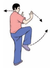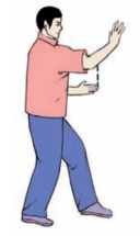 要点:身体要稳定,不可前俯后仰。两手分开时,腕部与肩齐平;蹬脚时,左腿微屈,右脚尖回勾,力点在脚跟,分手与蹬脚须协调一致,右臂和腿上下相对。如面向南起势,蹬脚方向应为正东偏南约45°。