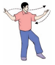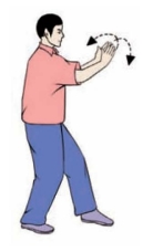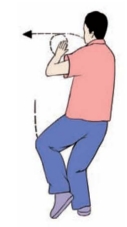 (2)身体重心再移至右腿,左脚收到右脚内侧,脚尖点地;同时两手由外圈向里圈划弧合抱于胸前,左手在外,手心均向后,眼平视左方(图3-3-121、3-3-122)。