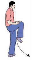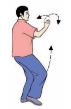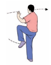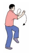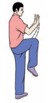 (1)右腿收回,屈膝平举;左手由后向上、向前下落至体前,两手心均翻转向上.两手同时向下划弧,分落于右膝盖两侧,眼视前方(图3-3-115、3-3-116)。