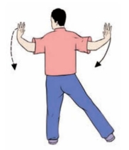 (1)左腿屈膝后坐,身体重心移至左腿,上体左转,右脚尖里扣;同时两拳变掌,由上向左右划弧分开平举,手心向前;眼视左手(图3-3-119、3-3-120)。