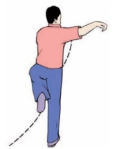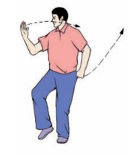 (1)左腿收回平屈,上体右转;右掌变成勾手,左掌向上、向右打弧下落.立于右肩前,掌心斜向后,眼视右手(图3-3-125、3-3-126)。