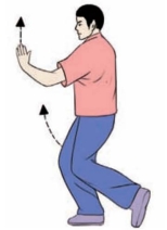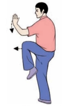 (4)右腿慢慢提起平屈,成左独立式;同时右勾手变掌,并由后下方顺右腿外侧向前弧形上挑,屈臂立于右腿上方,肘与膝相对,手心向左;左手落于左胯旁.手心向下.指尖向前;眼视右手(图3-3-130、3-3-131)