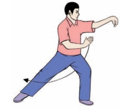 (3)身体重心前移,左脚跟为轴,脚尖尽量向外撇,左腿前弓,右腿后蹬,右脚尖里扣,上体微向左转并向前起身;同时左臂继续向前伸出(立掌),掌心向右,右勾手下落,勾尖向后;眼视左手(图3-3-129)。