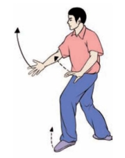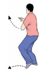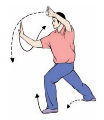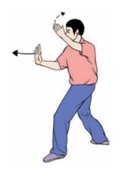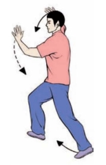 要点:完成姿势面向斜前方(如面向南起势。左右穿梭方向分别为正西偏北和正西偏南,均为35~45°)。手推出后,上体不可前俯,手向上举时,防止引肩上耸。一手上举一手前推要与弓腿松腰上下协调一致。做弓步时,两脚跟的横向距离在30cm左右。