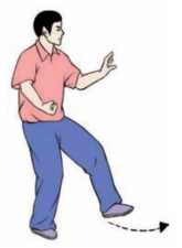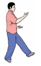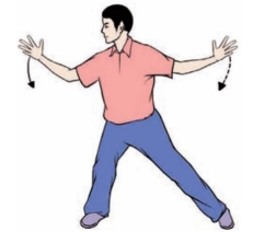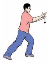 要点:两手左右分开下落时,要注意全身放松,同时气也徐徐下沉(呼气略加长)。呼吸平稳后.再收左脚走动休息。