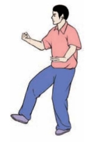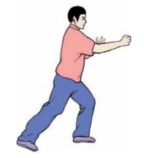 要点:右拳不要握得太紧,回收时前臂要慢慢内旋划弧,然后再外旋停于右腰旁,拳心向上。向前打拳时,松肩垂肘,右臂要微屈;弓步时,两脚横向距离在10cm左右。