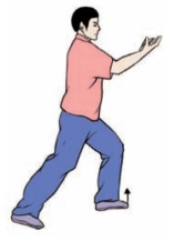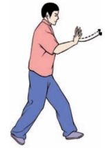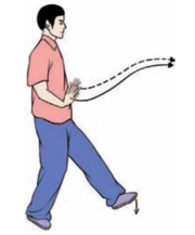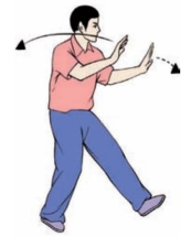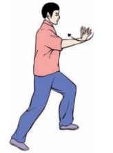 (2)两手在胸前翻掌,向下经腹前再向上、向前推出;腕部与肩平,手心向前;同时左腿前弓成左弓步;眼视前方(图3-3-165、3-3-166、3-3-167、3-3-168、3-3-169)。