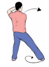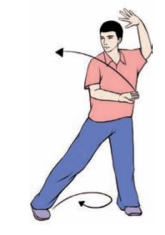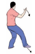 (1)屈膝后坐,身体重心移向右腿,左脚尖里扣,向右转体;右手随着转体动作向右平摆划弧.与左手成两臂侧平举,掌心向前,肘部微屈;两脚成八字步,眼视右手(图3-3-170、3-3-171)。