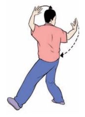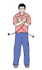 (2)身体重心慢慢移至左腿,右脚向左收回,两脚距离与肩同宽,两腿逐渐蹬直,成开立步;同时两手经腹前向上划弧交叉合抱于胸前,两臂撑圆,腕高与肩平,右手在外,成十字手,手心向后;眼视前方。