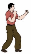 实战姿势通常也叫作预备式或格斗式,是格斗前所采用的临战运动姿势。它不仅能使身体处于强有力的状态,而且有最佳的快速反应能力,利于快速移动发起进攻和防守,并且暴露面小,能有效保护自己的要害部位。实战姿势分为左实战式和右实战式。下面以左实战式为例:两脚前后开立,前脚跟与后脚尖距离约同肩宽。左脚全脚掌着地,右脚跟稍抬起,前脚掌着地,两膝稍弯屈,自然里扣,身体重心右移,上体含胸收腹扭臀,左臂内曲约90°,拳眼与鼻尖平行。右臂内曲约45°,拳置于脖前,两肘自然下垂并稍向里合,下颌内收。目视对方上体(图3-4-1)。