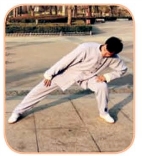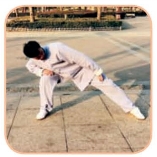 (4)重心下降成右偏马步状,同时,上体俯身右转,目视右脚尖。身体重心左移成左偏马步,同时,上体俯身左旋至左斜前方,目视右脚跟(图4-1-17、4-1-18)。