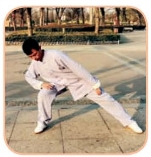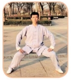 (2)屈膝下坐成马步,同时,两臂从两侧下落,两掌指扶在膝关节上方,目视前方(如图4-1-15)。