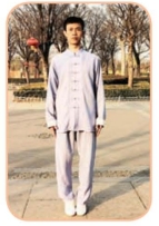 (1)接上式,立顶树脊,松肩坠肘,提肛收腹,手指下伸,同时脚跟提起,脚趾用劲,动作略停。