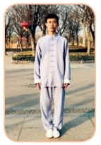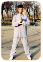 两脚并拢站立,两手自然下垂;百会虚领,舌抵上腭,目视前方。(图4-2-1)