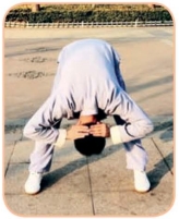 动作三:骶椎至腰椎、胸椎、颈椎、头,由下向上一次缓缓逐节伸直后成直立;同时,两掌掩耳,十指扶按枕部,指尖相对;目视前下方。重复二、三动作三遍,逐渐加大身体前屈幅度,并稍停。第一遍前屈小于90°,第二遍前屈约90°,第三遍前屈大于90°。体弱者可分别前屈约30°、45°、90°。