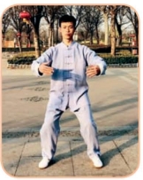 动作一:接上式。两手松开,两臂外旋,上体缓缓直立;同时,两臂伸直外展成侧平举,掌心向上,随后两臂上举,肘微屈,掌心向下;目视前下方。