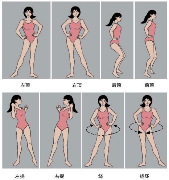 (1)顶髋:指髋关节做急速的水平移动,包括前、后、左、右顶髋。