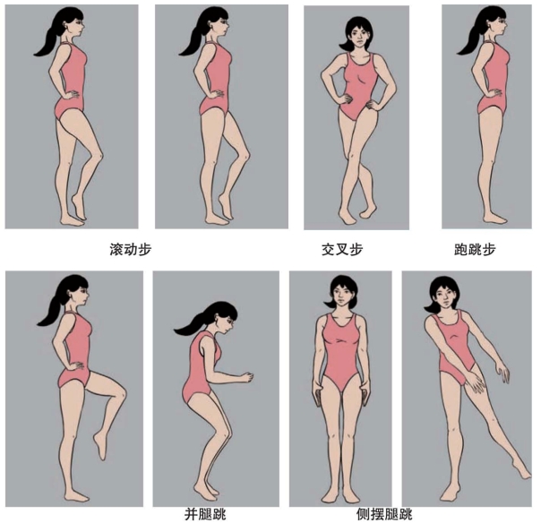 下肢动作由滚动步、交叉步、跑跳步、并腿跳和侧摆腿跳等动作组成,如图5-1-12所示。