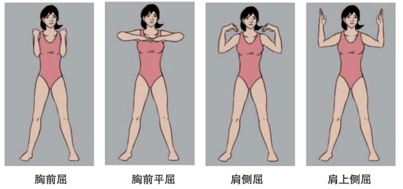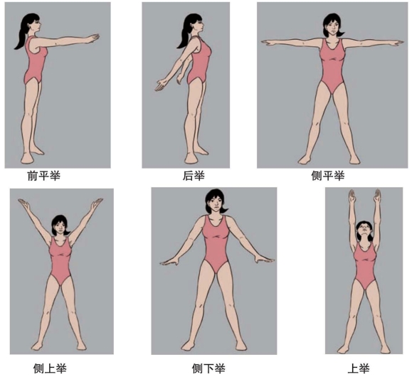 双臂的前、后、侧举,以及不同中间方向的举(如侧上举、侧下举等),如图5-1-4所示。