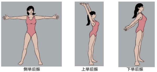 (6)振:指以肩为轴,手臂用力摆至最大幅度,包括侧举后振、上举后振和下举后振,如图5-1-7所示。