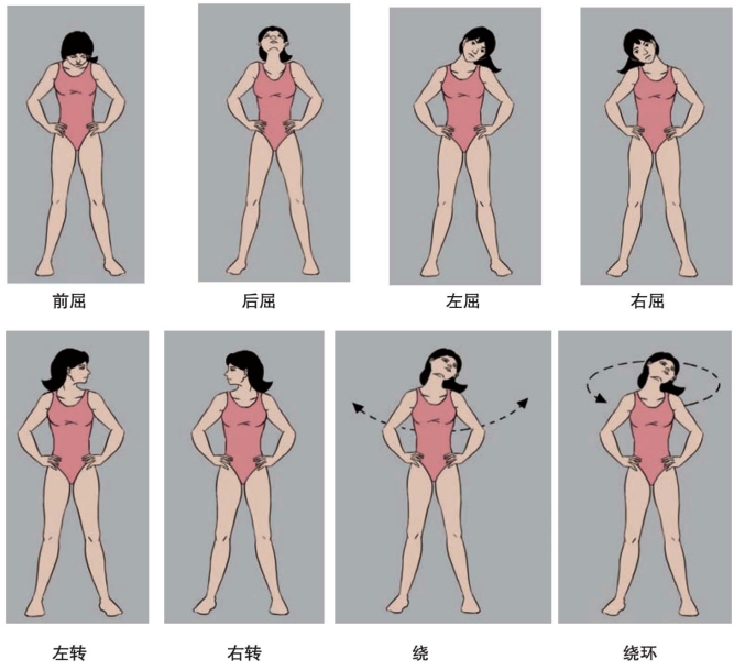 (1)屈:指头颈关节角度的弯曲,包括前、后、左、右屈。