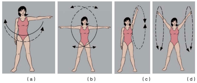 (4)肩绕环:指以肩关节为轴做360°及360°以上的圆形运动,包括单肩向前、后绕环,双肩同时或依次向前、后绕环。