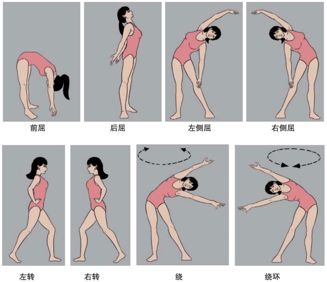 (3)绕和绕环:指下肢固定,上体沿垂直轴做弧形和圆形运动,包括左、右绕和绕环。