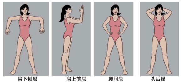 (2)屈:指肘关节产生了一定的弯曲角度,包括胸前屈、胸前平屈、肩侧屑、肩上侧屈、肩下侧屈、肩上前屈、腰间屈、背后屈、头上屈、头后屈,如图5-1-5所示。