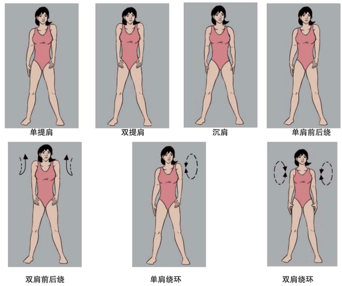 (1)提肩:指肩胛骨做向上的运动,包括单肩、双肩的同时提和依次提。
