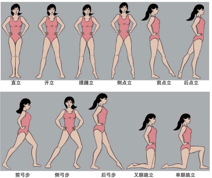 (4)点地立:指一腿直立(重心在站立脚上),另一腿向各方向伸直,脚尖点地,包括侧点立、前点立、后点立。
