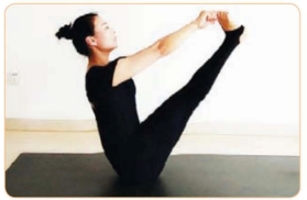 (3)呼气,右手大臂或肩头紧贴右膝外侧,左手臂从膝盖下方绕到后方,双手交握。