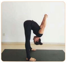 (6)吸气,慢慢抬起身体,左腿放低,双脚并拢,手臂保持向上伸直,之后回复身体直立,换另一侧腿重复相同动作;