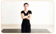 (2)双臂在胸前交叉,双手分别放入两侧的腋窝下,大拇指向上。或者,为了增强效果,双手握拳放于腋窝下。