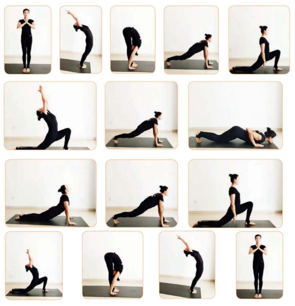 (12)呼气,左腿向前跨一大步回到两手之间,手指、脚趾成一直线,腹部,胸部,额头依次接腿,——站立前屈。
