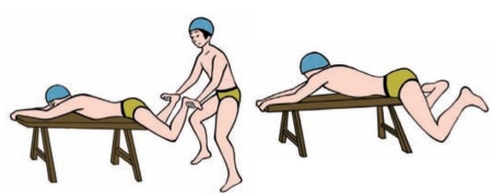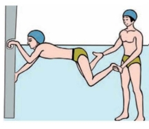收腿要慢,蹬夹腿要快而有力,两腿并拢后向前滑行(也可扶池壁、游泳板进行练习)(图图5-4-7)。