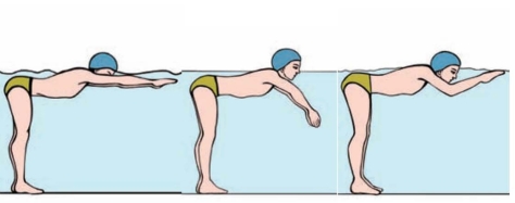 两臂伸直,向斜后方边划边屈臂。当臂划至肩的侧下方时,收手夹肘伸向前(图图5-4-8)。