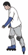 滑动过程中双脚平行蹲立滑行,随后脚尖内转,两脚以内侧轮柔和压紧地面;两腿弯曲,上体稍前倾,臀部下蹲,两臂前伸维持身体平衡。
