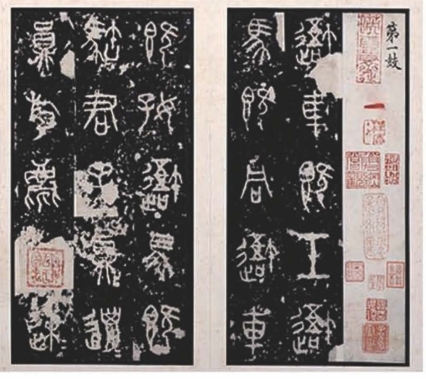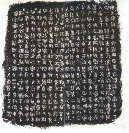 《东周石鼓文》为战国时代秦国刻石,是中国现存最早的文字刻石。字势雄强浑厚,朴茂自然,用笔匀圆挺拔,结体已趋方正,章法行列均衡、疏朗,线条饱满圆润,笔意浓厚,字里行间已经找不出象形图画的痕迹,完全是由线条组成的符号结构。字体是典型的秦国书风,并对后来秦朝小篆的出现产生了很大影响,在书法史上有承前启后的重要地位。
