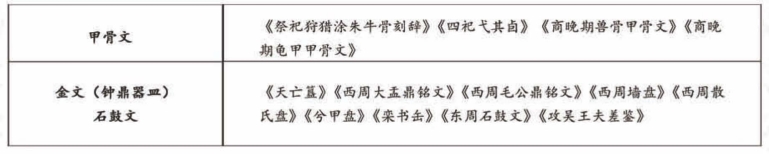 先秦时期的书法主要包括:殷商的甲骨文,东、西周的金文与石鼓文,周代的帛书与简册。