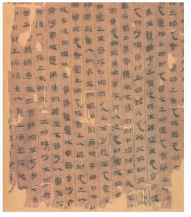 《马王堆帛书》用笔沉着、遒健,给人以含蕴、圆厚之感。它的章法也独具特色,既不同于简书,也不同于石刻,纵有行、横无格,长度非常自由,有强烈的跳跃节奏感,总体反映了由篆至隶的隶变阶段的文字特征。