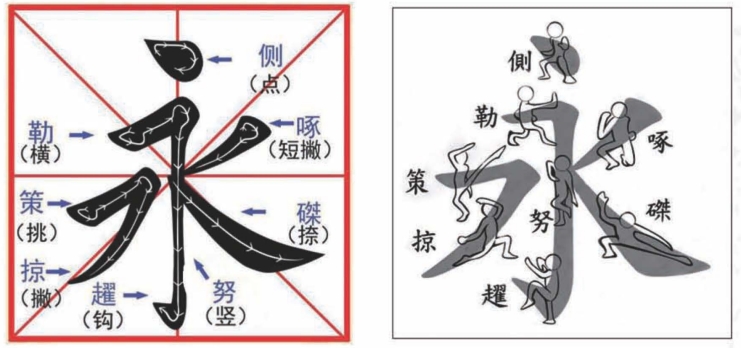 唐代张怀瓘在《玉堂禁经》中说,“大凡笔法,点画八体,备于‘永’字”,并有图示“永”字的八种点画。“永字八法”的笔画顺序为:点为侧,横划为勒,直竖为努,钩为趯,仰横为策,长撇为掠,短撇为啄,捺笔为磔。
