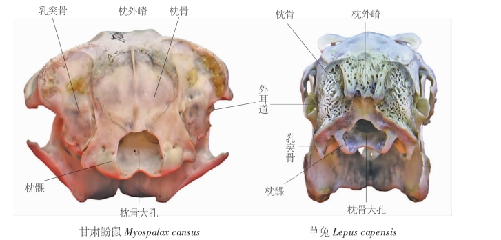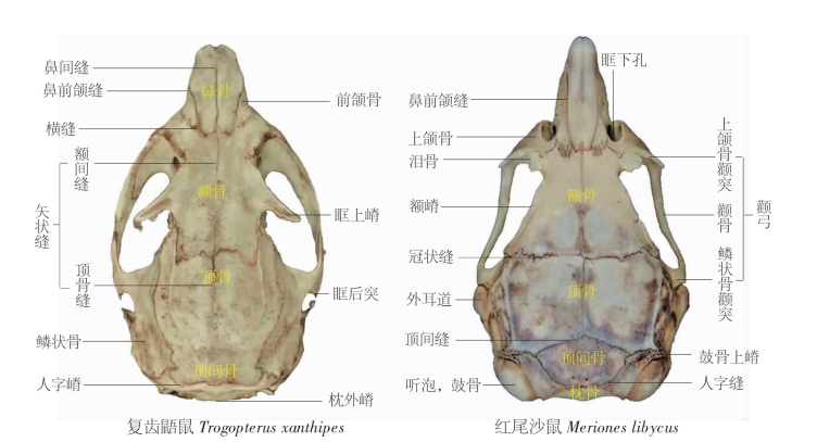 颅骨背面从后向前依次为枕骨、顶间骨、顶骨、鳞状骨、额骨、颧骨、泪骨、上颌骨、前颌骨和鼻骨(图1-3)。