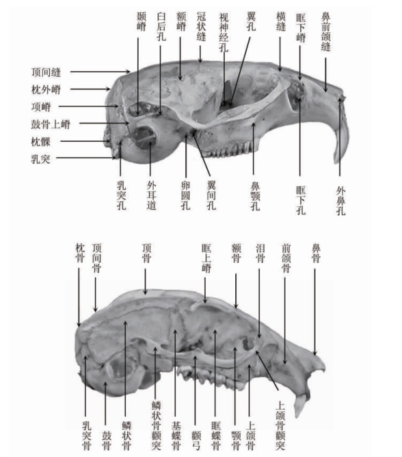 颅骨侧面从后向前依次为枕骨、顶间骨、乳突骨、鼓骨、鳞状骨、顶骨、颧骨、基蝶骨、前蝶骨、颧骨、泪骨、上颌骨、前颌骨和鼻骨(图1-5)。