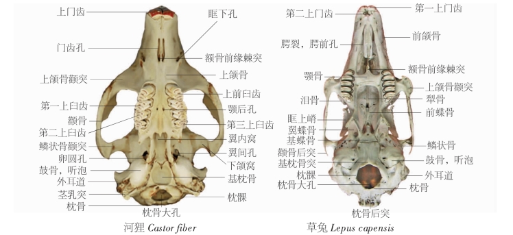 颅骨腹面由后向前依次为枕骨、鼓骨、基蝶骨、前蝶骨、鳞状骨、颧骨、腭骨、上颌骨、前颌骨(图1-4)。
