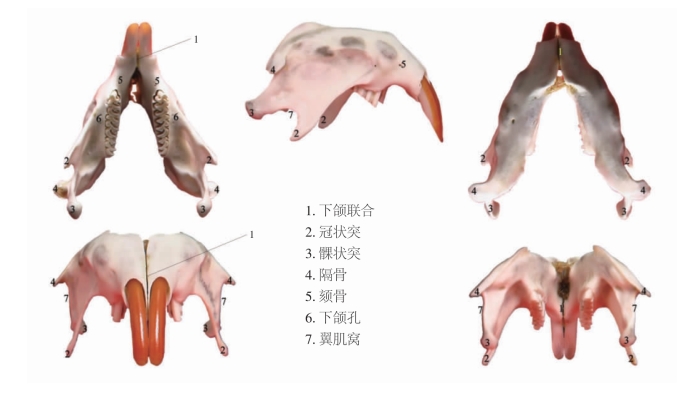 左右下颌骨(mandibula)在前端以软骨结合相连,包括骨体及下颊支两部(图1-7)。骨体包括前端有的门齿部和臼齿部。门齿与臼齿齿槽间是宽阔的虚齿位。下颌支靠后面有三个突起,最上面的为钩状的冠状突,或称喙突,供颞肌附着。中间的突起为髁状突,或称关节突。冠状突和髁状突之间的半圆形凹缘称下颌切迹(incisuramandibulae)。最下面的一个突起为朝向后方的隅突(processusa ngularis),其外侧腹缘有药肌嵴,嵴lae)。上方的凹面,称咬肌窝,供咬肌的附着。颏孔(foramen mentale)位于该嵴终止处的前方。下颌支的内侧面有下颌孔,位于髁状突的基部,约在关节面和第三臼齿后缘连接线的中点上。下颌齿槽神经由下颌孔通入,沿下颌体内的下颌管前行,由颏孔穿出。下颌支内侧的凹面称翼肌窝,前上方的凹面为翼外肌附着处。靠后下方的凹面为翼内肌附着处。