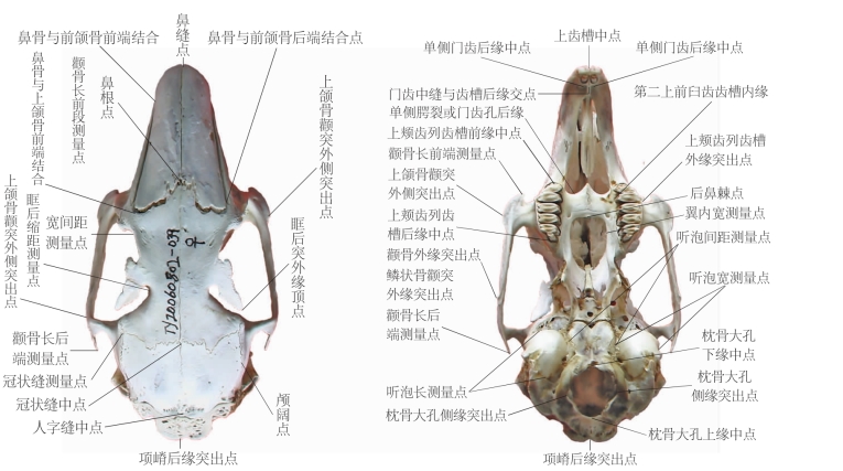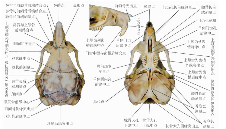 (1)上齿槽中点(prosthion)指两前颌骨最前端中点,对于前颌骨前端分开的类群,采用两前颌骨最前端连线之中点。