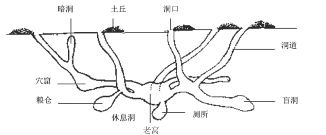 鼠类的洞穴除了少数树栖、半水栖的鼯鼠、松鼠和麝鼠外,绝大部分是在地下挖土掘洞过穴居生活。鼠类洞道不但是鼠类居住和休息的场所,而且还是它们避敌、贮存食物、分娩哺乳、蛰眠过冬的地方。尽管洞外四季寒暑交替,风霜雨雪等气候变幻无常(夏季在骄阳直晒下地表温度可高达50~60℃,冬季在冰封雪盖地表温度会下降到-30℃至-40℃);然而,在鼠洞里却能保持一个相对稳定的小生境,在洞道的深处始终维持着比较适宜的温度和湿度,因此,很少会影响鼠类的正常生活。鼠类挖洞穴居的习性是在自然选择过程中形成的一种本能,也是对于外界环境变化的适应性。