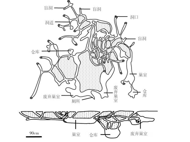 图1-12 布氏田鼠洞穴结构示意(仿方喜业,1981)